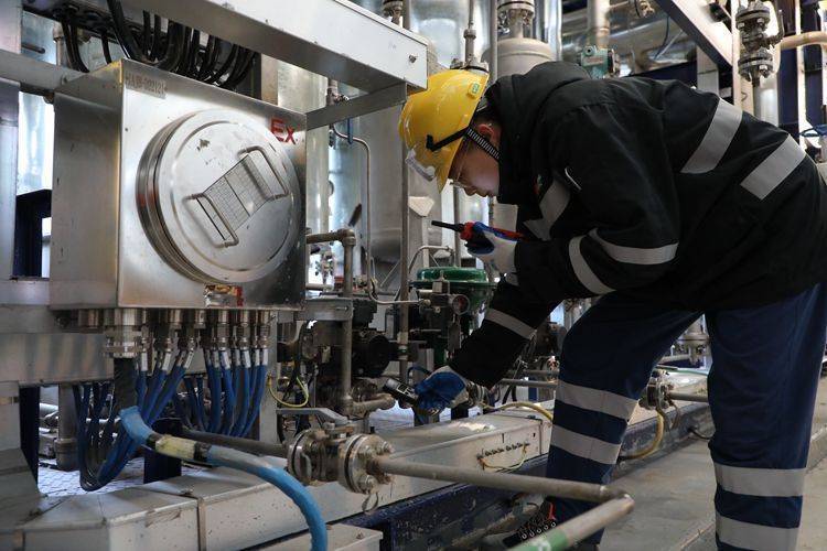 制储氢副操张岩正在碱液制氢厂房内检查漏点